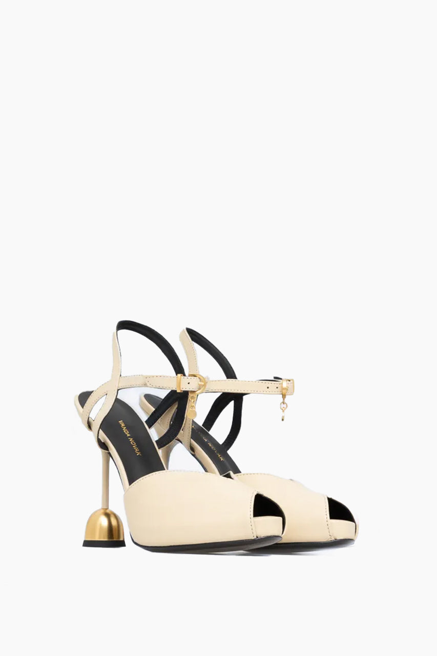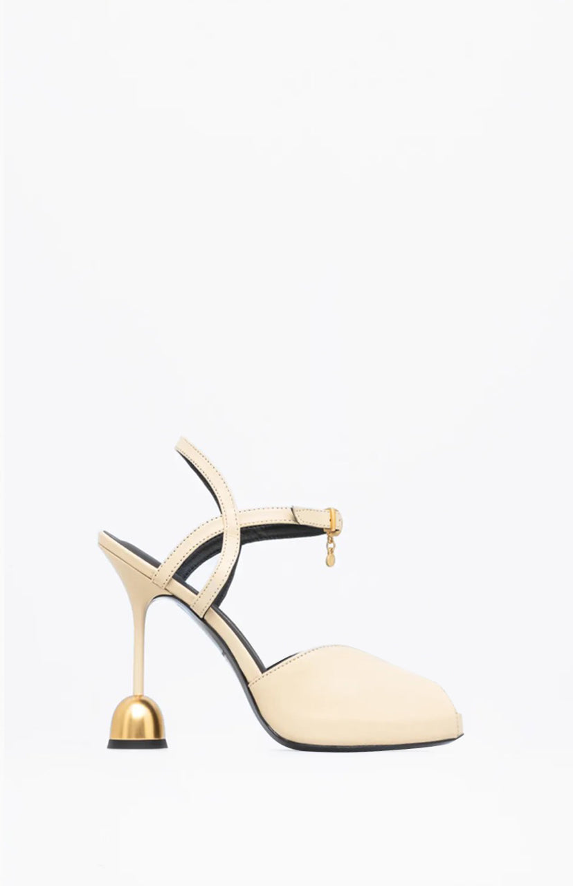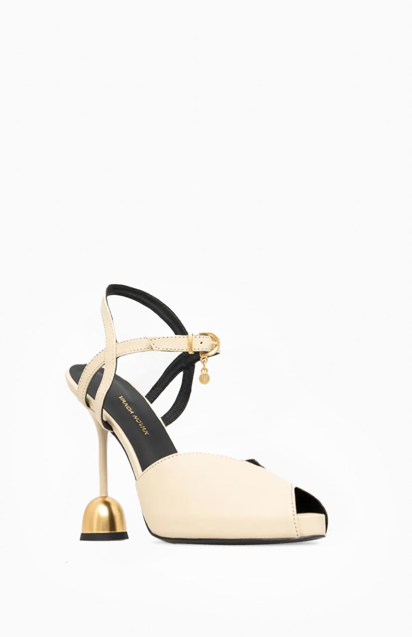 Dazzling elegance. The ivory color gives the shoes subtlety, and their cut refinement. The open heel and toes add lightness, breaking the high 11-centimeter heel. Comfort is provided by delicate straps around the ankle that keep the shoes in place, a 2-centimeter platform under the toes that reduces the height of the heel, a large gold ball at the end of the heel, guaranteeing stability and a memory foam insole that adapts to the shape of the foot. And all this is made of high-quality leather.