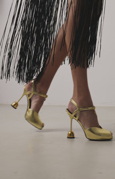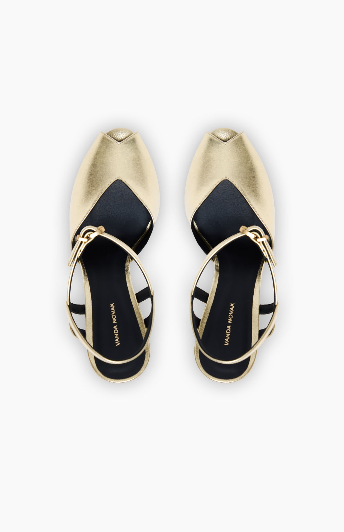 Open heel and toe stilettos on a high, high 110 millimeter heel. Wearing comfort is provided by a large golden Vanda Novak ball, which is a unique decorative element and guarantees step stability. Delicate straps around the ankle keep the shoes on the foot, while a 20 millimeter platform under the toes reduces the height of the stiletto. Additional convenience is provided by a memory foam insert that adapts to the shape of the foot, providing softness and comfort. The shoes are made entirely of high-quality Italian leather. The gold, metallic color on the top layer adds exceptional shine.