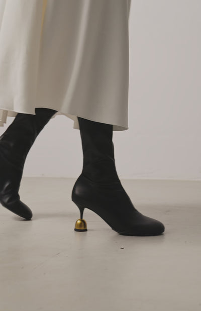 Wysoka na 65 milimetrów szpilka zakończona została dużą kulką Vanda Novak z powłoką z 24-karatowego złota, dzięki czemu buty są stabilne i eleganckie. Wkładka z wypełnieniem z pianki memory zapewnia wygodę i miękkość podczas chodzenia.