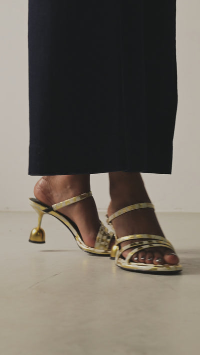 Układ cienkich pasków, które oplatają stopę zapewnia stabilność, a wysokiej jakości skóra naturalna eleganckie wykończenie. 65-milimetrowy obcas zwieńczony dużą kulką, pokrytą warstwą z 24-karatowego złota sprawia, że kroki są pewne i stabilne.