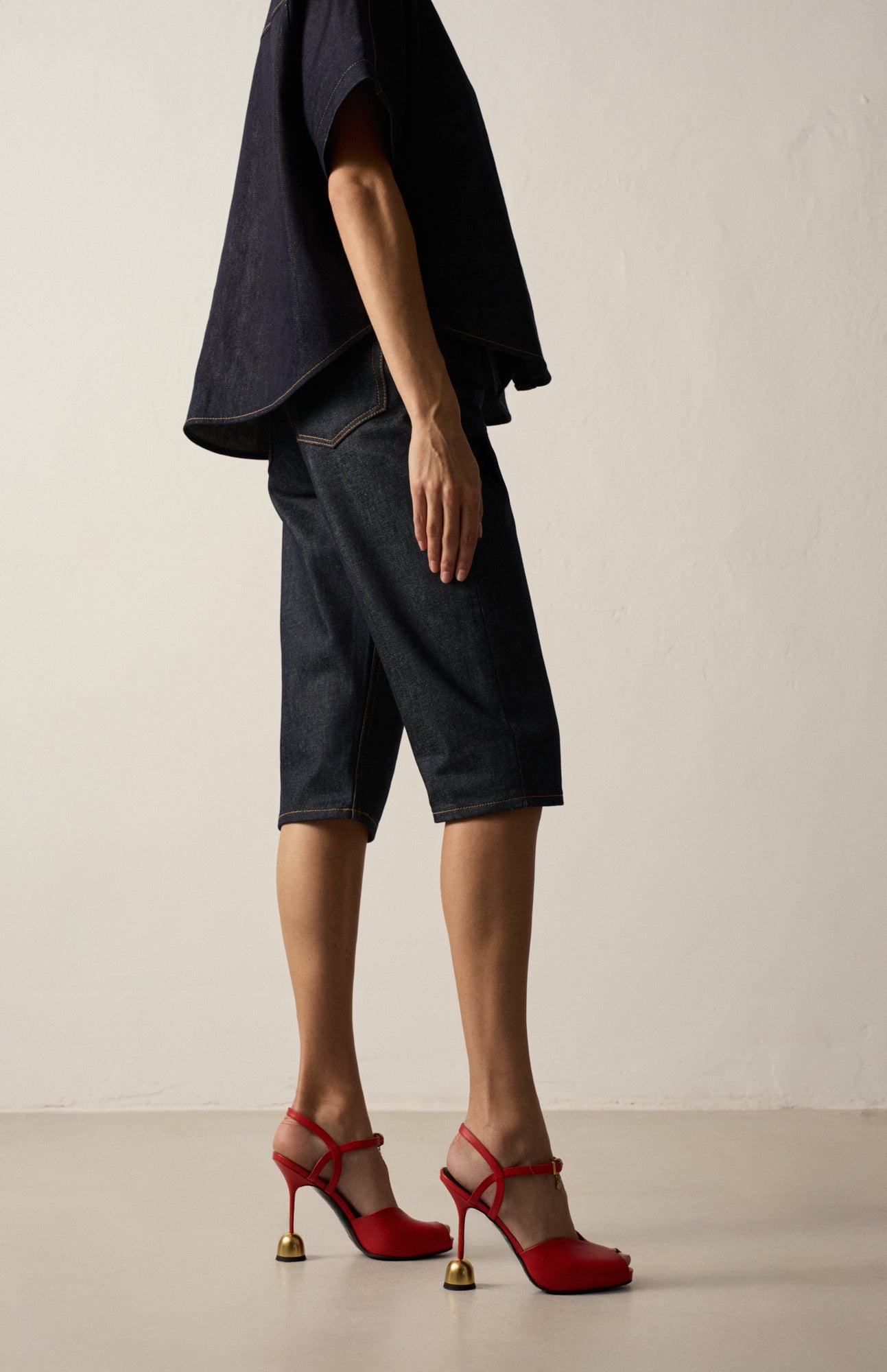 Sandały na wysokim obcasie o zmysłowym kroju i wyrazistym kolorze czerwieni. Cholewka wykonana z naturalnej skóry, z delikatnym paskiem wokół kostki i wycięciem na palce, subtelnie eksponuje stopę. W przedniej części zastosowano ukrytą platformę, która niweluje odczuwalną wysokość obcasa, zwiększając wygodę podczas chodzenia.