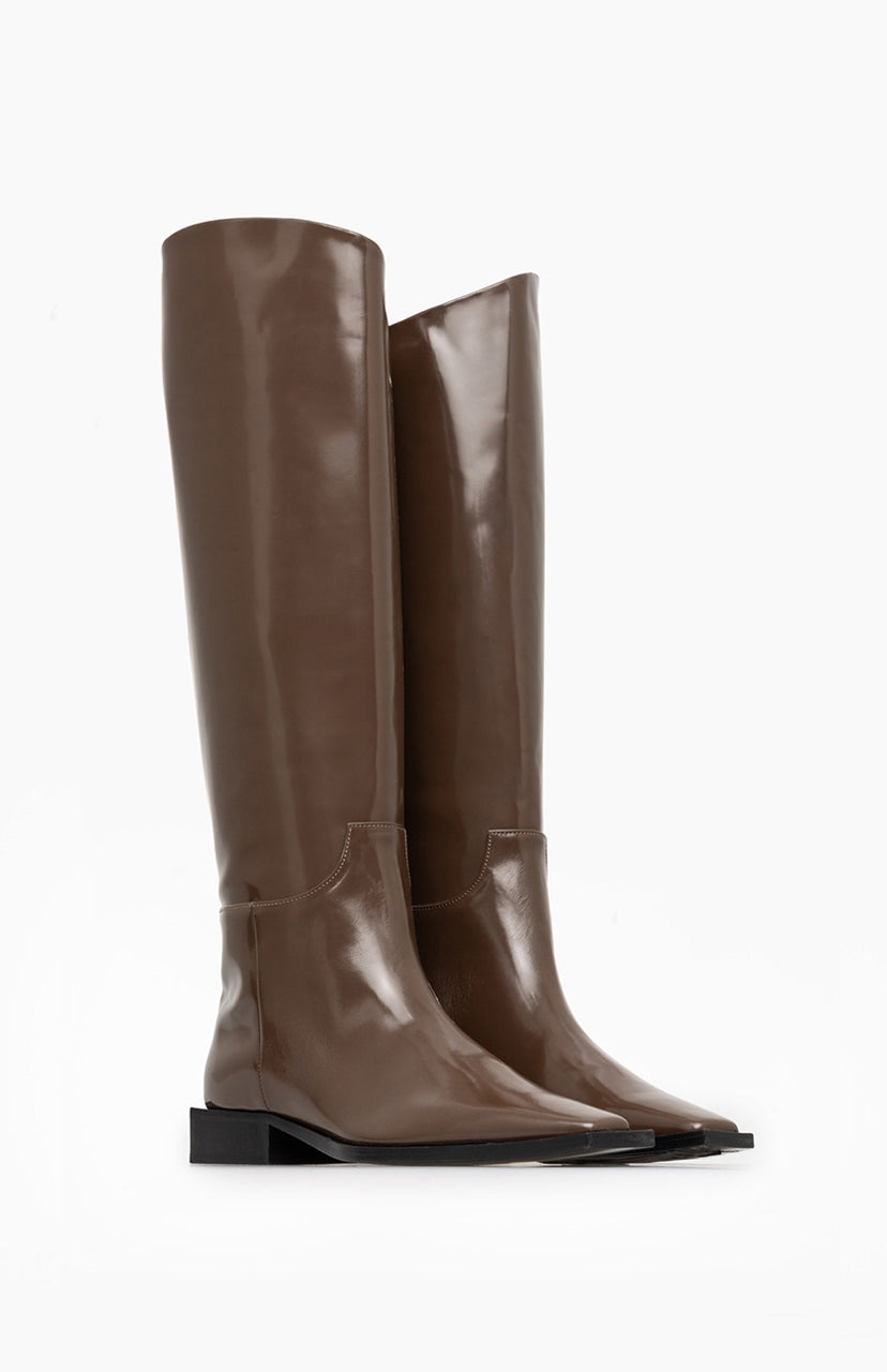 Brązowe, błyszczące kozaki ze skóry. Karmelowy kolor i odcinająca się ciemna podeszwa tworzą estetyczne połączenie. Klasyczny krój oficerek został przełamany unikatowymi detalami.